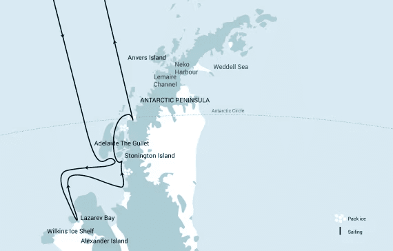 Arrival in Antarctica. The expedition will explore the Antarctic Peninsula, focusing on historically significant areas such as the Bellingshausen Sea and Marguerite Bay.